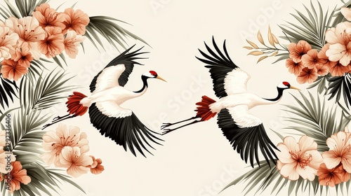 © Paul, Fototapeta premium Romantic Toile de Jouy pattern with graceful cranes flying among palm groves and exotic blooms, classic tropical print