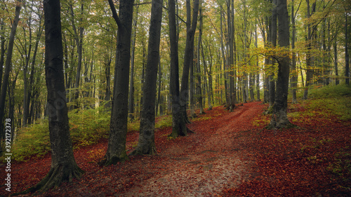 Obraz premium Romantic trail in autumn colored forest. Red leaves on the ground