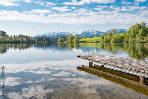 Naklejka premium Romantischer See mit Holzsteg im Allgäu, Spiegelung