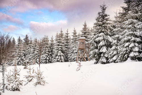 Fototapeta premium Romantischer Winterwald mit Jagd Hochsitz
