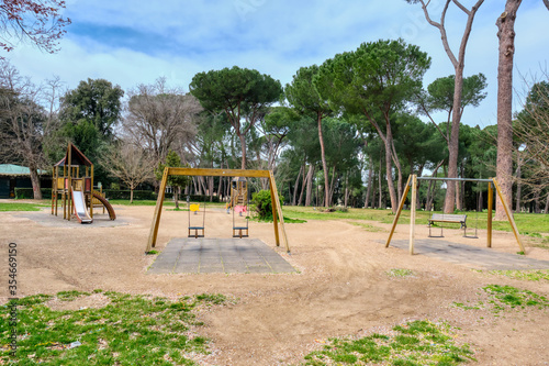 Fototapeta premium Rome, Italy - March 2020: Empty child's playground in Villa Borghese. Sadness of an empty children's playground, normally very busy with kids playing. Another face of the COVID-19 epidemic in Italy
