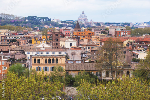 Naklejka premium Rome panorama, Lazio, Italy, beautiful panoramic vibrant summer wide view of Roma and Vatican, with cathedrals, cityscape and scenery beyond the city, seen from observation deck