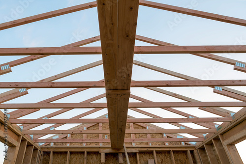 Fototapeta premium Roof support beams and wood studs framing in new home construction