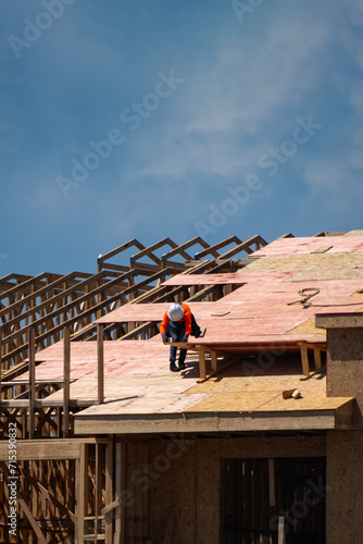 © Volodymyr, Obraz premium Roofing on rooftop. Builder roofer install new roof. Construction worker roofing on a large roof apartment building development. Roofer carpenter working on roof structure construction site.