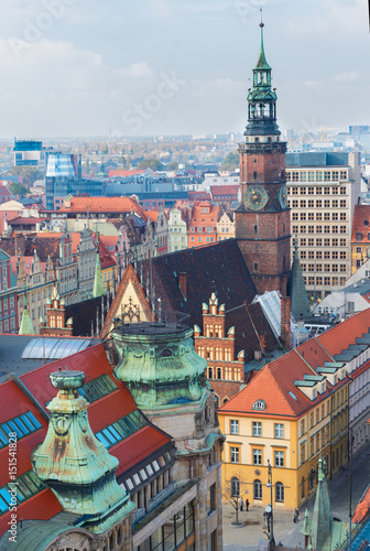 Obraz premium roofs and towers of Wroclaw - bird eye view of colorful roofs of old town with city hall tower, Wroclaw, Poland