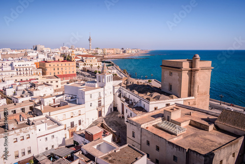 Obraz premium Roofs of houses and towers in aerial view in the town of Cádiz overlooking...