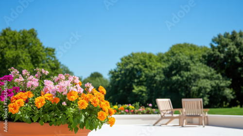 Obraz premium Rooftop, A vibrant rooftop garden bursting with colorful flowers, showcasing a beautiful urban oasis perfect for relaxation and outdoor enjoyment.