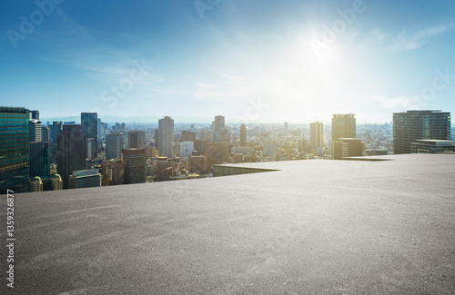 © Image Craft, Fototapeta premium Rooftop balcony with a city backdrop under blue skies and sunshine.