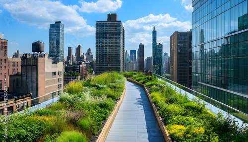 Obraz premium Rooftop Garden Pathway with City Skyline View