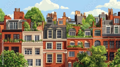 © Zam, Fototapeta premium Rooftop gardens on brick townhouses.
