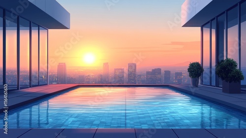 © Almahyra, Fototapeta premium Rooftop infinity pool with city sunset view.