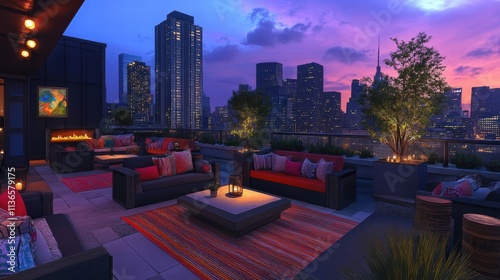 © arisa, Obraz premium rooftop lounge with city skyline view at dusk