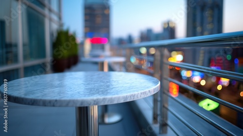 Obraz premium Rooftop Marble Tabletop with City View, Evening Scene, Modern Architecture, Urban Lifestyle and Scenic Skyline