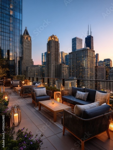 Obraz premium Rooftop patio at twilight with city views