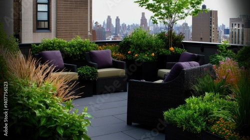 Naklejka premium Rooftop patio seating area with city view, lush landscaping