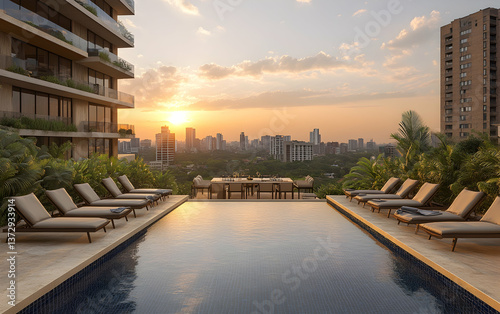 Obraz premium Rooftop Pool with Loungers and City Skyline at Sunset with orange Sky and...