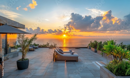 Obraz premium Rooftop sun loungers at sunrise over ocean view