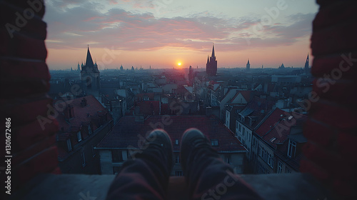 © susanti, Fototapeta premium Rooftop Sunset View Through Brick Wall