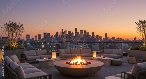 Obraz premium Rooftop Terrace Dusk Cityscape Fire Pit - Relaxing rooftop scene, city skyline at dusk, warm fire pit, comfortable seating, urban tranquility. Symbolizing: peace, luxury, community, warmth, escape