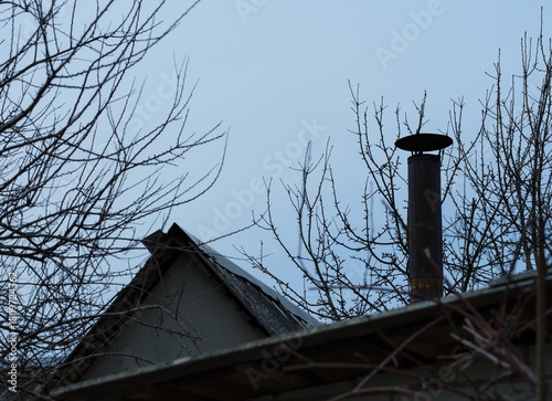 Fototapeta premium Rooftops and chimney among bare branches against a gloomy sky.
