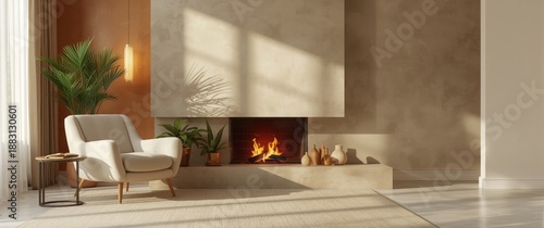 © AkuAku, Fototapeta premium Room interior layout with a chair and potted plants