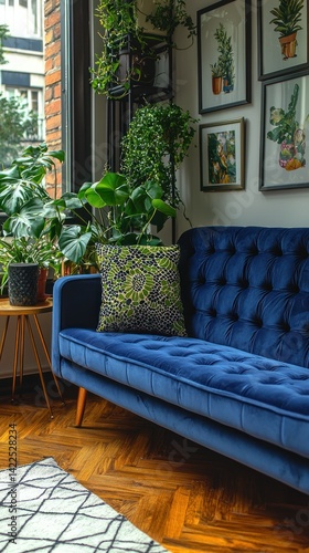 © sweattea, Fototapeta premium Room with blue couch and plants and art prints