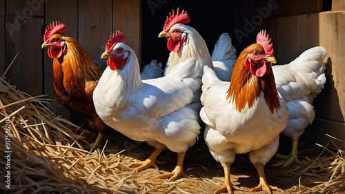 © VFX1988, Fototapeta premium Rooster and Hen on a Farm with eggs