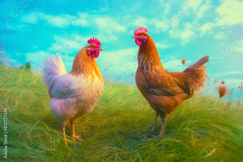 Fototapeta premium Rooster and hen on green grass. Colorful background. Copy space.