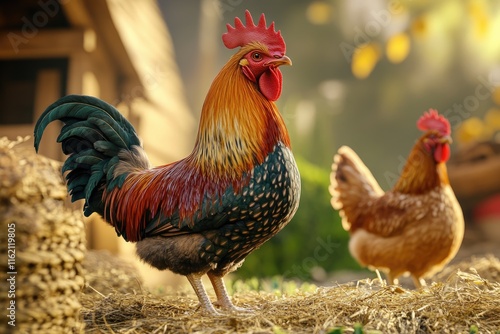 © Roshani, Fototapeta premium Rooster and hen on the farm. Selective focus