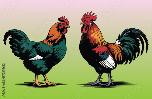 © Aziz, Fototapeta premium Rooster and Hen Picture. Vector Illustration or Icon