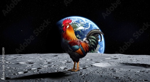 © chat, Naklejka premium Rooster on moon, Funny space animal, First chicken space,