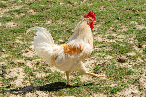 Fototapeta premium rooster outside in the meadow, organic livestock farming, free-range