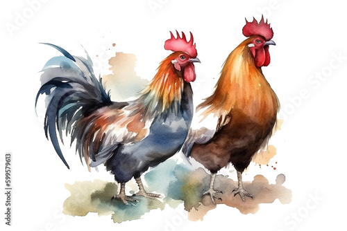 © AlexaSokol83, Fototapeta premium Roosters farm in willows character clipart, white background.