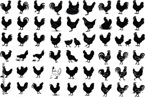 © logodesign11, Naklejka premium Roosters, Hens, and Chickens Silhouette | Rural Farm Animals and Domestic Bird Illustration Roosters, Hens, and Chickens Silhouette | Farm Birds and Poultry Vector Collection
