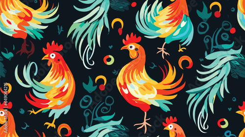 © Qaasim, Obraz premium roosters pattern. Bright pattern for textiles and decor. Color pattern.
