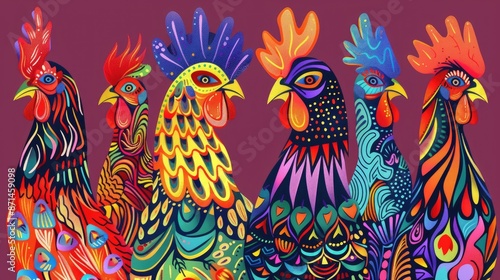 Fototapeta premium Roosters with colored horizontal patterns drawn by hand