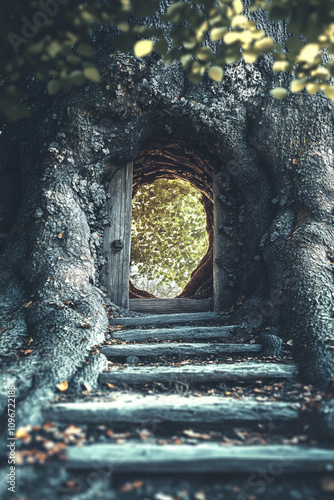 Obraz premium Roots and foliage frame the rustic entrance of a magical tree, creating a...
