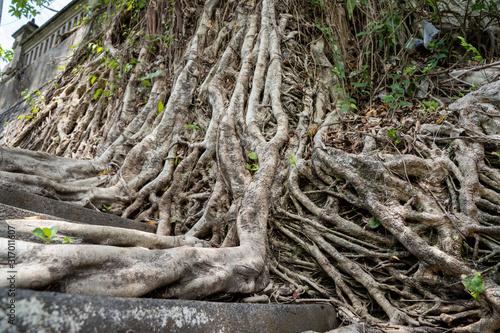 Fototapeta premium Roots of a tree invading a stone staircase