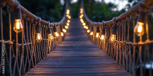 © Mona - Design, Fototapeta premium rope wooden bridge and bulb light decorated with warming twilight evening