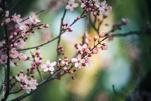 © Vanell, Obraz premium Rosa Blüten mit grün-blauem Hintergrund und schönem Bokeh