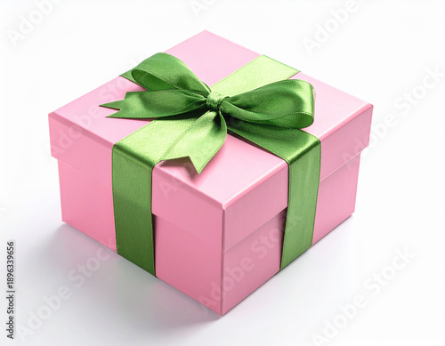 Obraz premium Rosa Geschenkbox mit grüner Schleife auf weißem Hintergrund