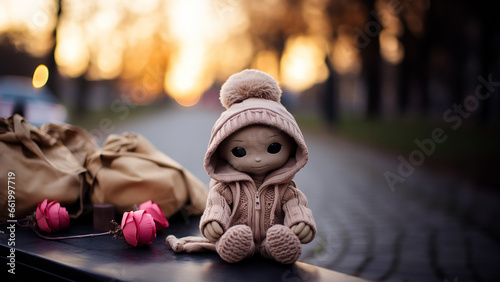 Naklejka premium Rosa Puppe sitzt auf der Sitzbank alleine im Querformat, ai generativ