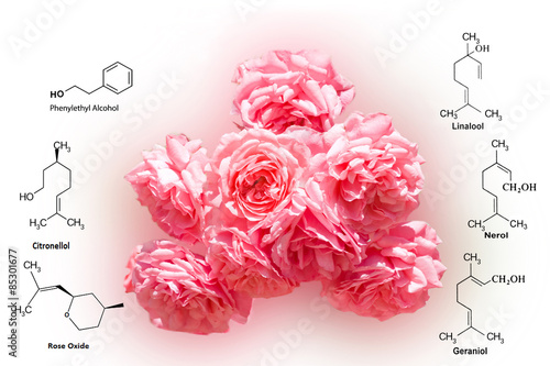 Obraz premium Rose aromate. The chemical components of the smell. Aromatic oil.