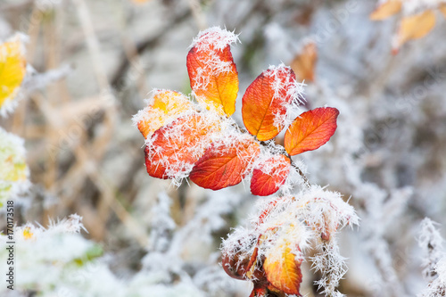 © Juhku, Fototapeta premium Rose bush frozen leaves