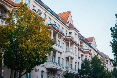 © Novanture, Fototapeta premium rose colored buildings in a street at treptower park