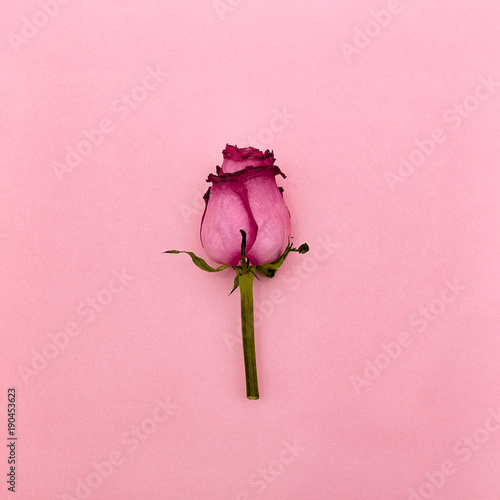 © Picture Store, Fototapeta premium Rose flower Top view Rose on a short stem is lying on a pink background Flat lay photo mockup with empty space for text