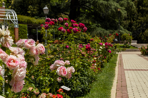 Fototapeta premium Rose Garden in Madrid. Botanical garden with different species of rare and...