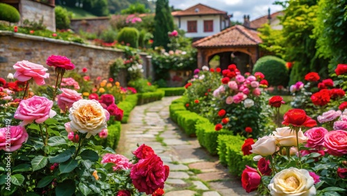 © Praphunsak, Fototapeta premium Rose Garden in Nessebar, Bulgaria , petals, beauty, petals, beauty, island, Mediterranean, bloom, ancient, old town, rose