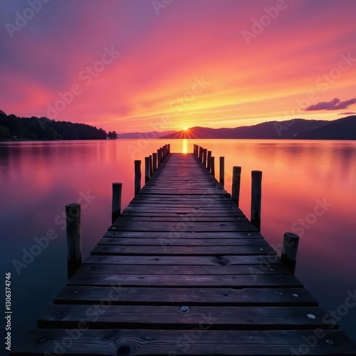 © Gball, Fototapeta premium Rose-hued sunrise illuminates ancient wooden jetty on still lake, weathered, still, picturesque
