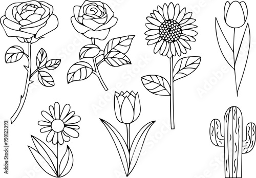 © JRedwan Stock, Fototapeta premium Rose, sunflower, tulip flowers vector outline on a white background, clipart, cutout